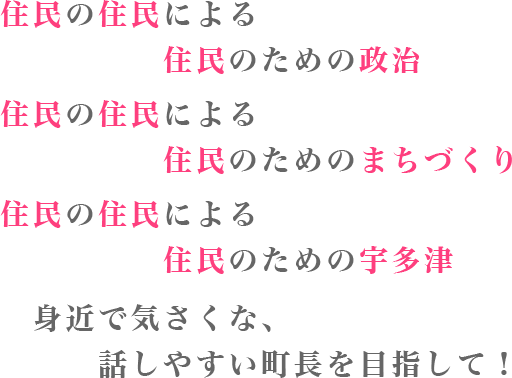 を中心に、宇多津の発展に全力を尽くしてまいります。